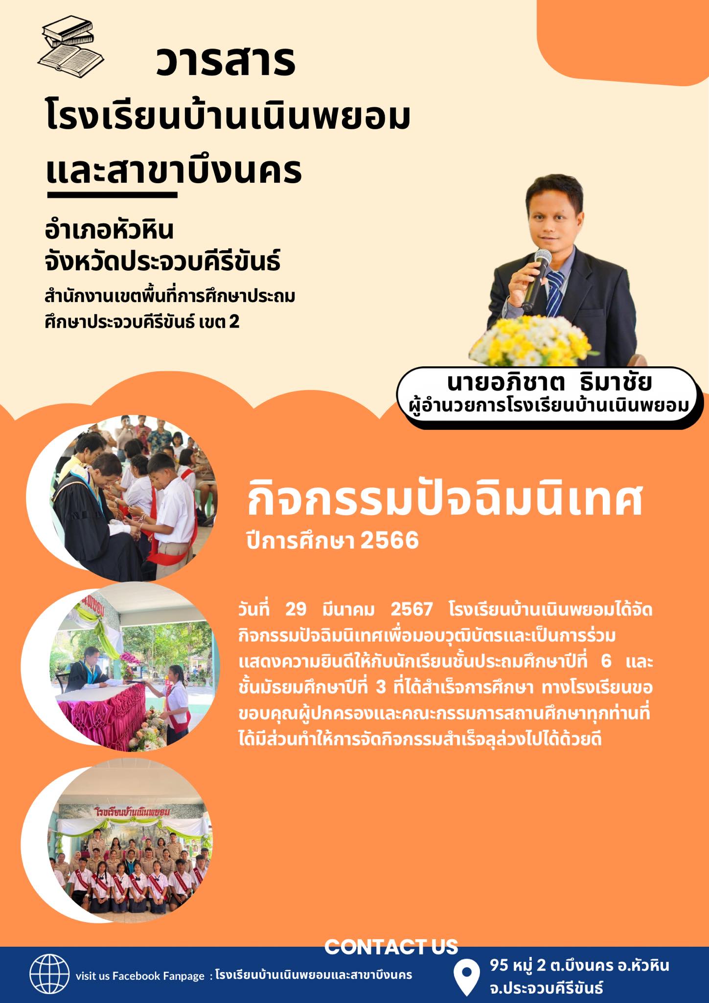 วันที่ 29 มีนาคม พ.ศ.2567 โรงเรียนบ้านเนินพยอมได้จัดกิจกรรมปัจฉิมนิเทศเพื่อมอบวุฒิบัตร และร่วมแสดงความยินดีแก่นักเรียนชั้นประถมศึกษาปีที่ 6 และระดับชั้นมัธยมศึกษาปีที่ 3 ที่สำเร็จการศึกษาในปีนี้